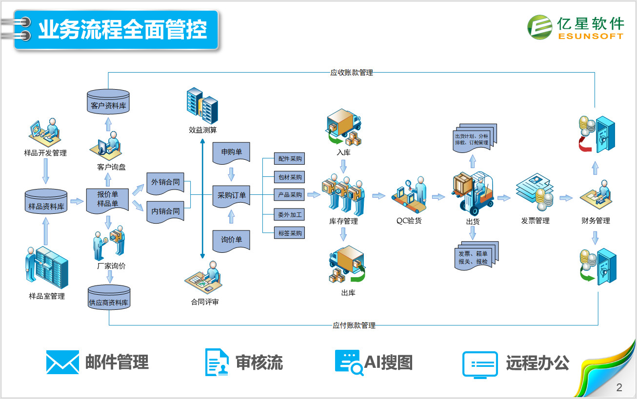 理顺公司的全部业务流程,建立起研发、销售、采购、生产、财务统一的协作平台,实现信息联动和业务协同;