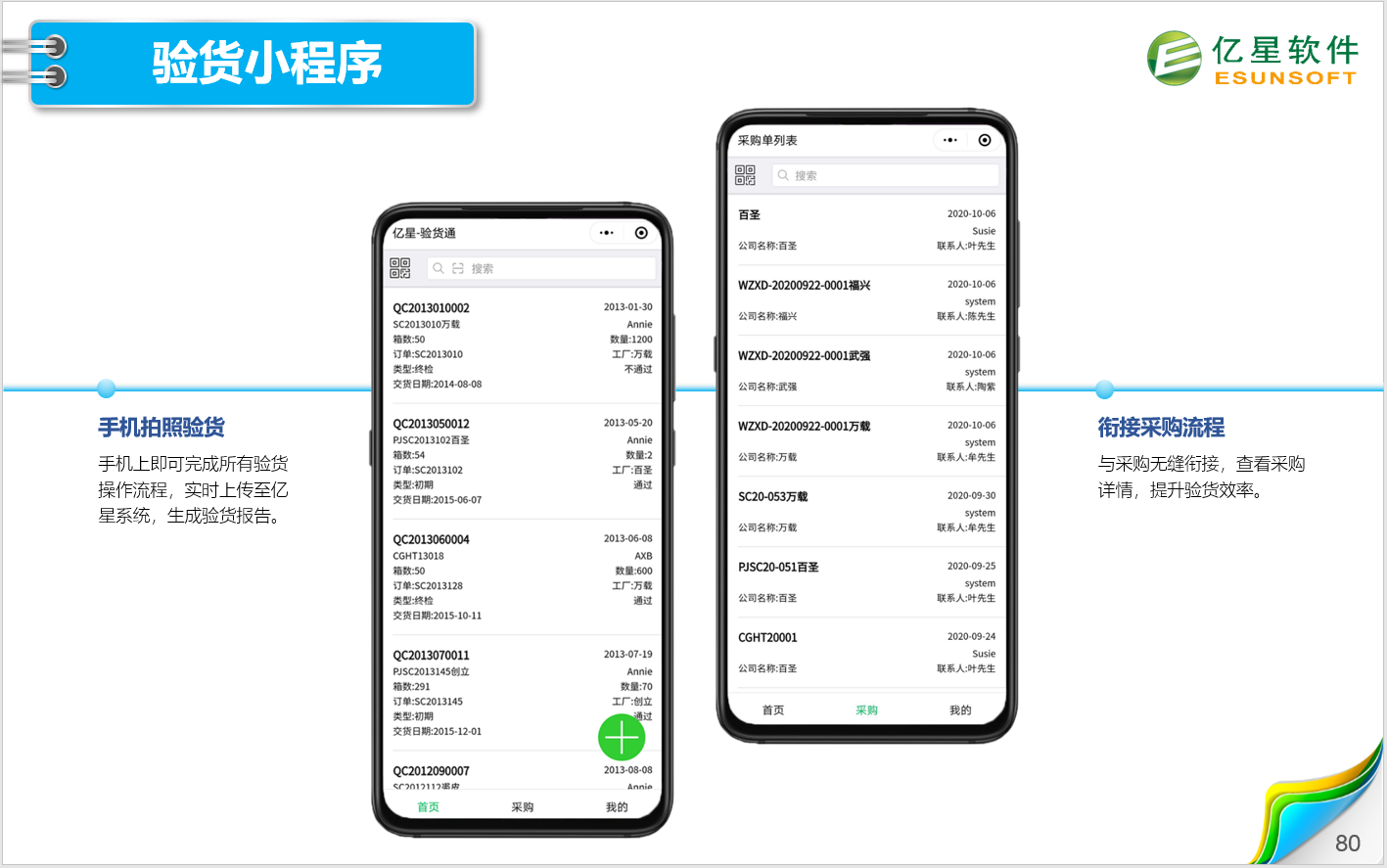 根据采购数量并结合STD105E验货标准,系统自动换算抽样的数量以及对应的主要缺陷和次要缺陷允收范围。通过验货APP,随时随地用手机拍照并归档验货情况,验货的结果含图片会第一时间与系统对接,相关人员可实时掌握验货进度及情况。
